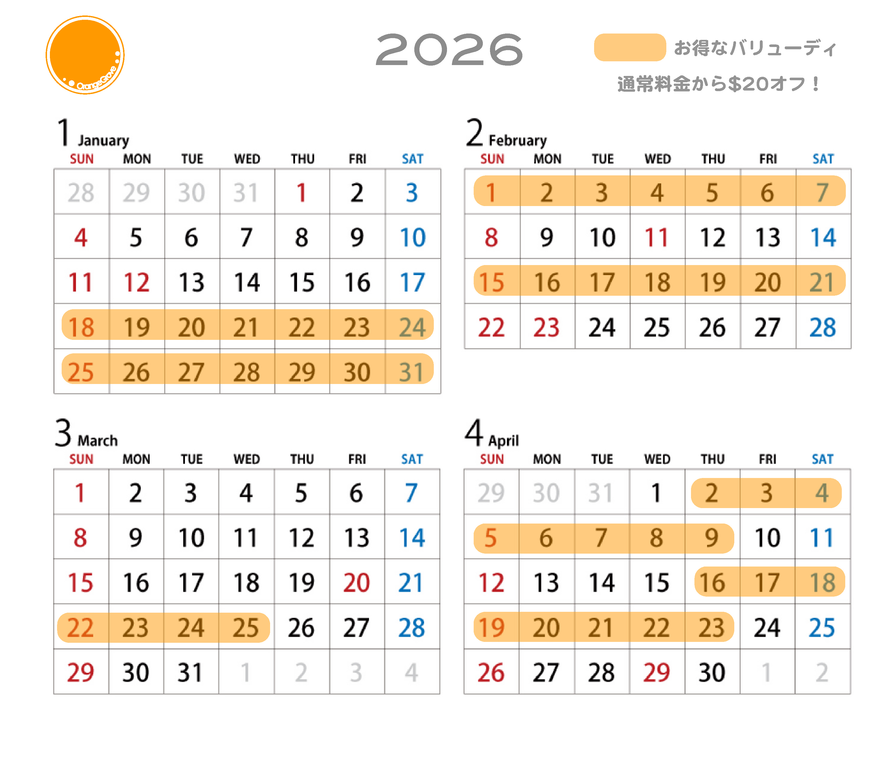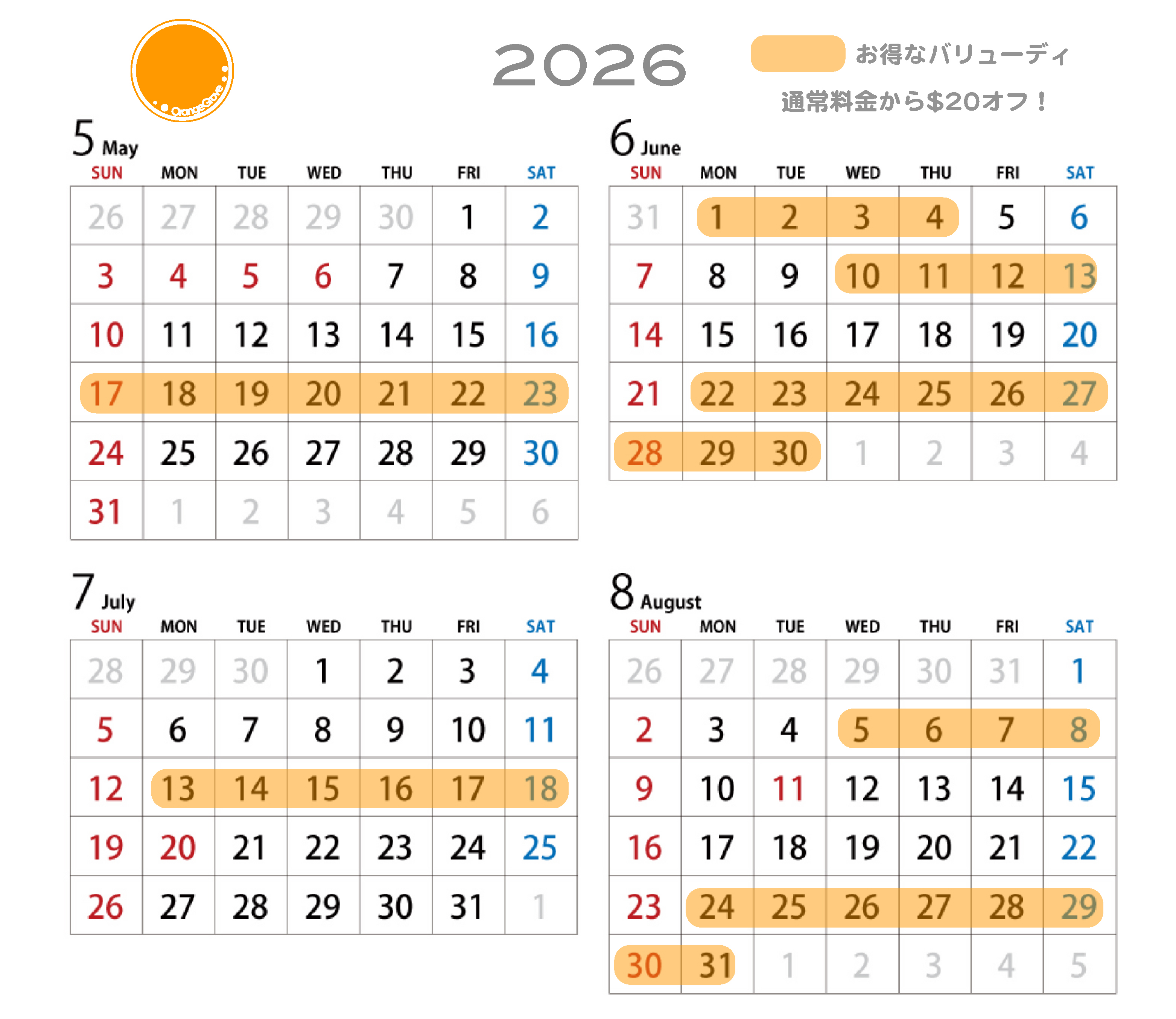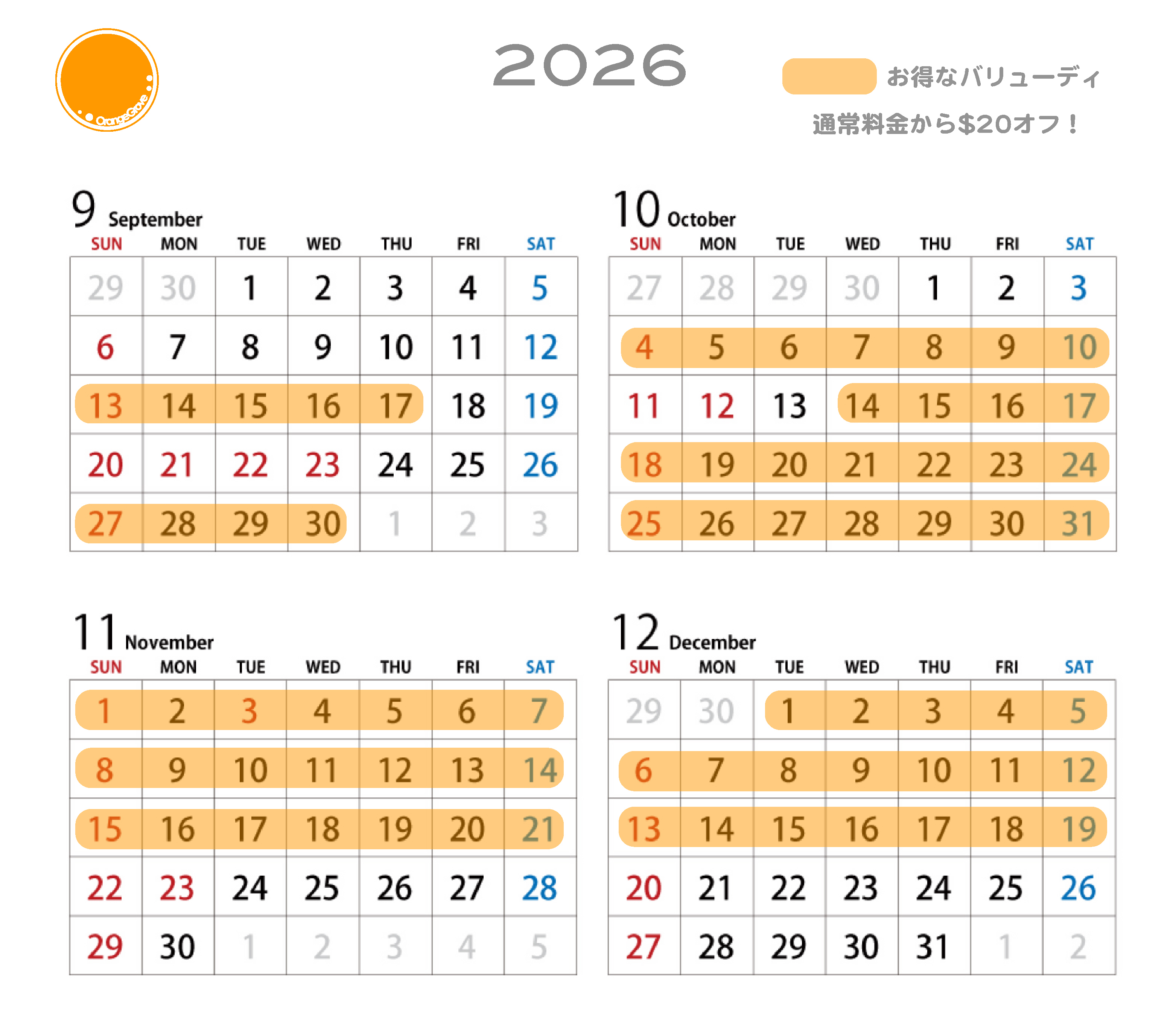 色の付いている日は、通常価格の20ドル引きになります。